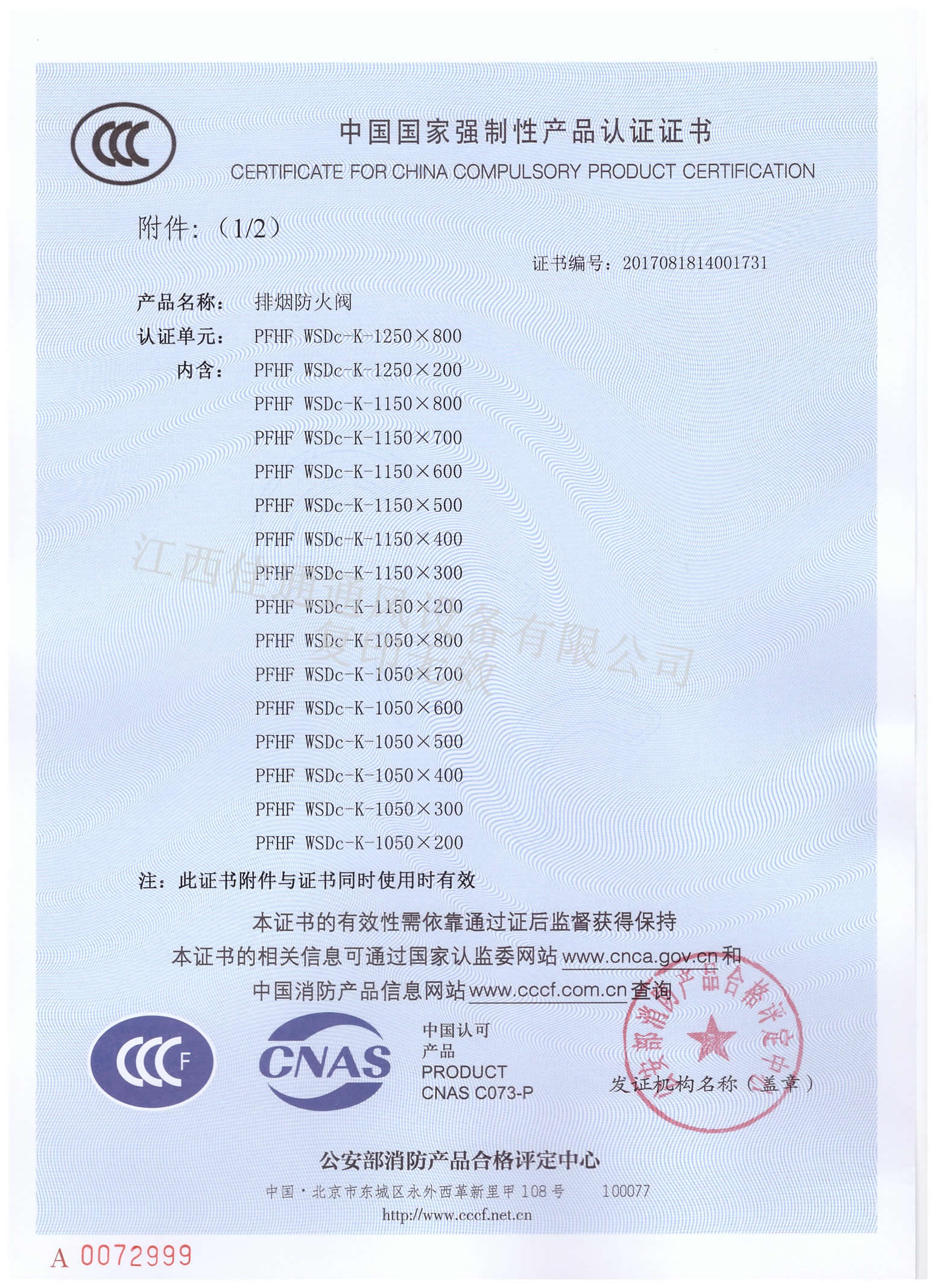 消防3C認證證書排煙防火閥1250×800(分型1)