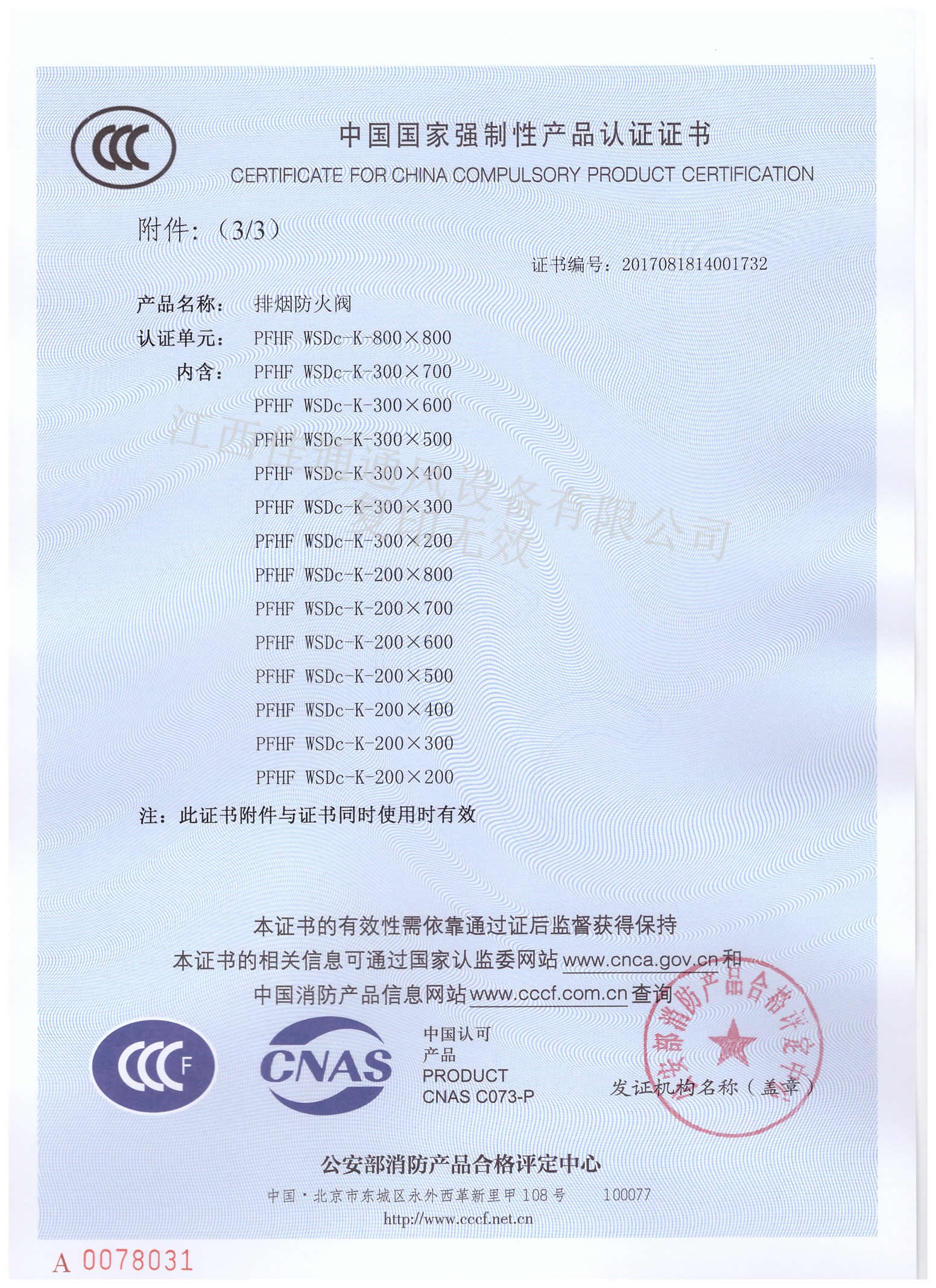 消防3C認(rèn)證證書(shū)排煙防火閥800×800(分型3)