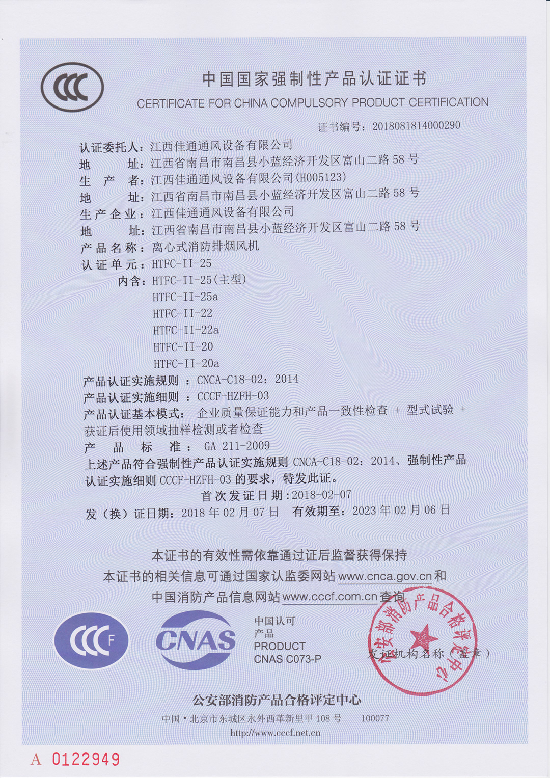離心式消防排煙風(fēng)機(jī)(雙速)HTFC-II-25(主型)消防3C認(rèn)證證書(shū)