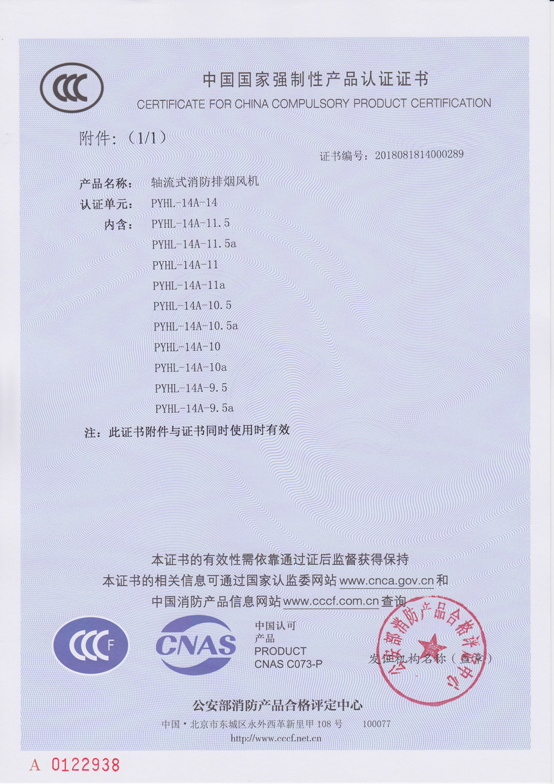 軸流式消防排煙風(fēng)機(jī)PYHL-14A-14(分型)消防3C認(rèn)證證書