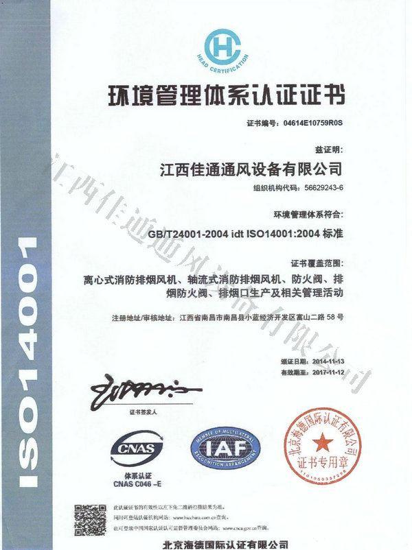 環(huán)境質量管理體系認證證書