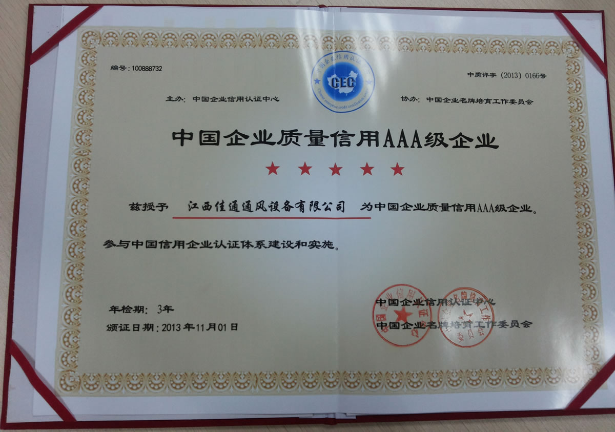 當(dāng)前位置:風(fēng)機(jī)廠家 > 資質(zhì)證書 > 中國(guó)企業(yè)質(zhì)量信用AAA級(jí)企業(yè)