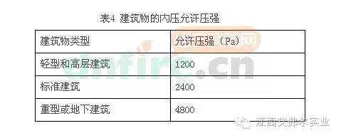 防護(hù)區(qū)內(nèi)門、窗上的玻璃允許壓強(qiáng)不應(yīng)低于建筑物的允許壓強(qiáng)。目前國內(nèi)各設(shè)計(jì)部門防護(hù)區(qū)內(nèi)圍護(hù)結(jié)構(gòu)承受內(nèi)壓的允許壓強(qiáng),無論建筑物是輕型和高層建筑,還是標(biāo)準(zhǔn)建筑及地下建筑,均設(shè)定為1.2KPa,該值的設(shè)定是依據(jù)GB50370-2005標(biāo)準(zhǔn)中3.2.6條款,參照美國NFDA12B-1980標(biāo)準(zhǔn)中給出的,若設(shè)計(jì)部門和用戶需提高防護(hù)區(qū)內(nèi)圍護(hù)結(jié)構(gòu)承受的允許壓強(qiáng),應(yīng)由建筑設(shè)計(jì)部門試驗(yàn)給出。