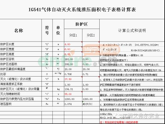 注:(1)IG541混合氣體滅火系統(tǒng)防護(hù)區(qū)泄壓口總泄壓面積計(jì)算和電子表格編制方法與七氟丙烷滅火系統(tǒng)相同,這里不再贅述。