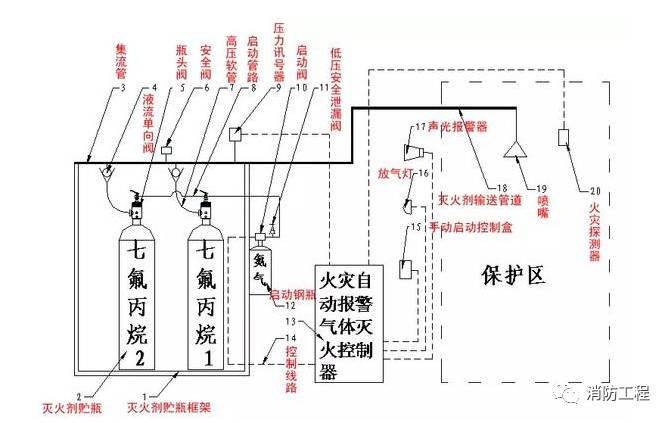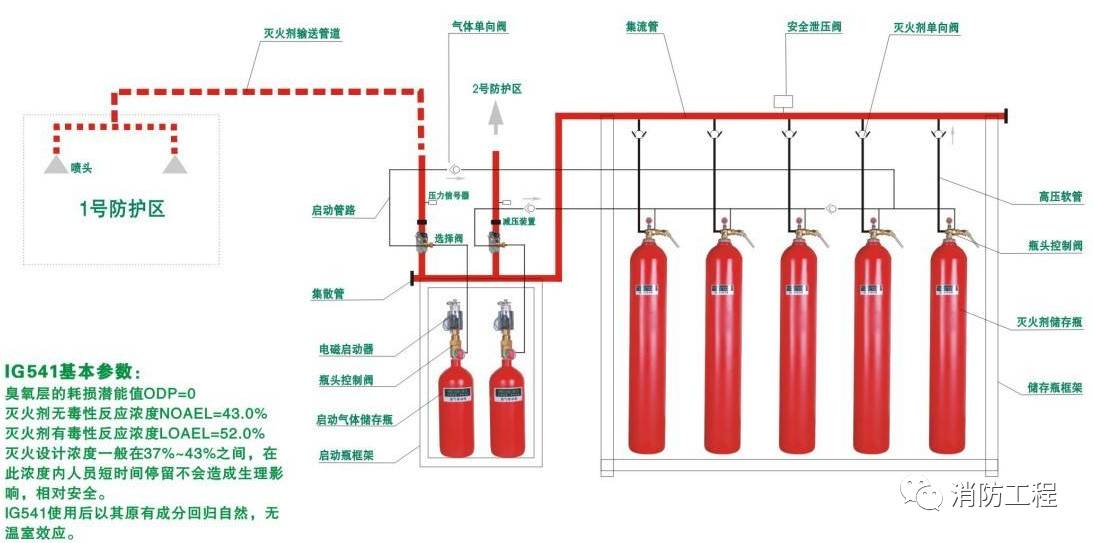 氣體滅火系統(tǒng)一般由滅火劑瓶組、驅(qū)動(dòng)氣瓶組、單向閥、選擇閥、減壓裝置、驅(qū)動(dòng)裝置、集流管、連接管、噴嘴、信號(hào)反饋裝置、安全泄壓裝置、控制盤、檢漏裝置、低泄高封閥、管路管件等部件構(gòu)成。不同的氣體滅火系統(tǒng)其結(jié)構(gòu)形式和組成部件的數(shù)量不完全相同。
