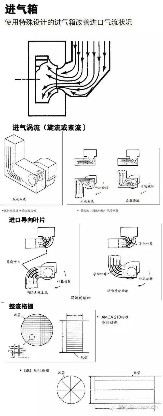 進口風管,進口彎管,進口箱,進口渦流 (旋流或紊流〕,進口導向葉片,整流器,封閉式 (箱形效應〕,有障礙的進口。