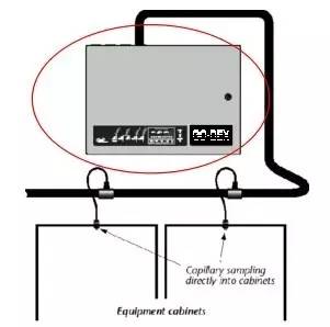 典型的吸氣式感煙火災(zāi)探測器的安裝方式,所有盤內(nèi)的空氣樣品透過軟管匯流到采樣管送到探測主機進行煙霧檢測,利用管路及軟管抽取機柜內(nèi)部的空氣進行分析。