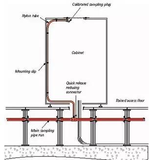 吸氣式感煙火災(zāi)探測器的采樣管路配置相當(dāng)靈活,采樣管可以配置在機柜上方,利用軟管及機柜上方的開孔即可抽取機柜內(nèi)部的空氣。采樣管路也可以配置在機柜下方,利用軟管延伸到機柜內(nèi)部的頂端來抽取空氣樣本。