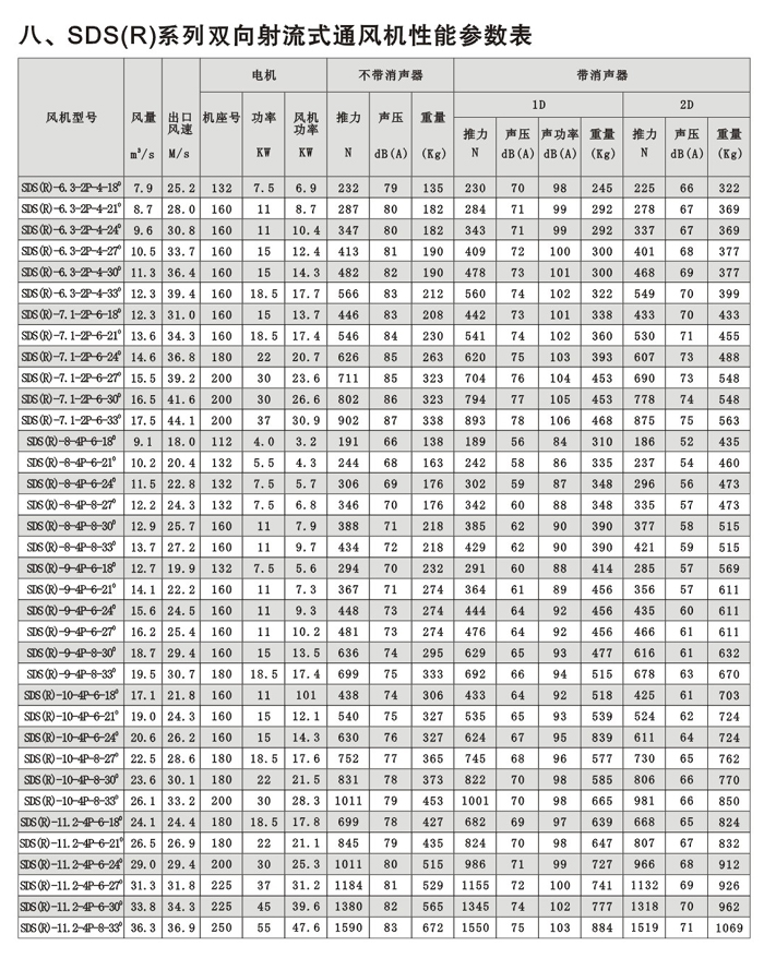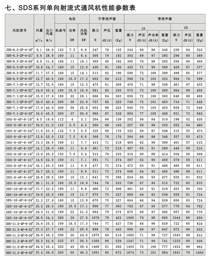 SDS系列射流風(fēng)機(jī)規(guī)格自(1)400mm—①1600mm,分單向運(yùn)轉(zhuǎn)軸流風(fēng)機(jī)和可逆式(雙向)運(yùn)轉(zhuǎn)軸 流風(fēng)機(jī)二大類,最大推力有3500N,對任一負(fù)荷和工況均可選擇高效、低噪聲的風(fēng)機(jī)。